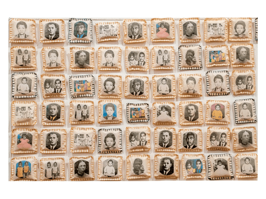 A artista brasileira Rosana Paulino recorre a algumas dessas referidas práticas do Candomblé como elementos de reflexão importante para discutir a história brasileira, enfatizando os fios invisíveis da colonização que ainda persistem na realidade presente. Na obra “Parede da Memória” (1994), Paulino nos apresenta a 1.500 patuás, cuidadosamente costurados, dispostos em uma parede extensa, em que cada uma das peças possui uma foto de uma pessoa ou família de origem negra.